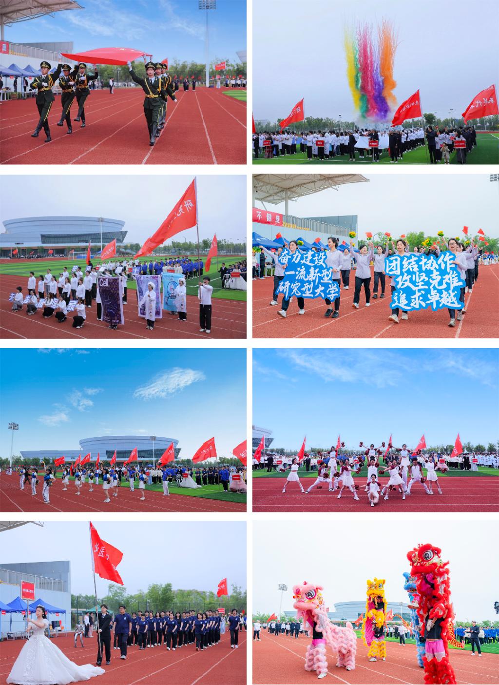 上午8時(shí)30分,運(yùn)動(dòng)會(huì)正式開幕,在雄壯激昂的《運(yùn)動(dòng)員進(jìn)行曲》中,國旗護(hù)衛(wèi)隊(duì)引導(dǎo)11個(gè)學(xué)生運(yùn)動(dòng)員方隊(duì)和6個(gè)教職員工方隊(duì)依次入場。身著色彩斑斕隊(duì)服的運(yùn)動(dòng)員們,如同躍動(dòng)的音符,踏著整齊劃一的步伐從主席臺(tái)前經(jīng)過。他們昂首挺胸,激情四射,響亮的口號聲此起彼伏,將拼搏奮進(jìn)的體育精神化作矢志新型研究型大學(xué)建設(shè)的錚錚誓言,激蕩在每個(gè)人的心間。17個(gè)代表隊(duì)精彩紛呈、創(chuàng)意滿滿,人工智能機(jī)器人、舞龍舞獅、哪吒鬧海等各展風(fēng)采,盡顯各專業(yè)和各單位的鮮明特色和遠(yuǎn)大目標(biāo),為全校師生呈上一場熱血沸騰的視覺盛宴。壓軸登場的拉拉隊(duì)以活力舞蹈與青春律動(dòng)點(diǎn)燃全場,將開幕式氛圍推向高潮。