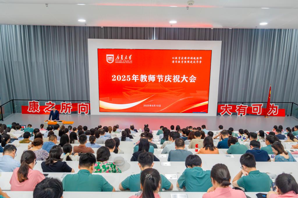 校長董爾丹發表教師節慶祝大會致辭,代表學校向全體教職醫護員工致以節日的祝福和問候。他指出,作為中國第一所以健康促進為核心、在生命健康領域唯一的新型研究型大學,我們必須要回答好“健康中國2030”這張考卷,提供好生命健康促進的康大方案。希望全體教職醫護員工要牢記“為黨育人、為國育才”的初心使命,在三尺講臺以仁愛之心點亮學生人生道路,在實驗室里以嚴謹之志探索康復科技前沿,在醫療一線以精湛之術守護生命健康平安,在服務崗位以奉獻之心保障學校順暢運行。希望全體教職醫護員工要勇擔“賦能失能以使能”的康復使命,堅守“讓失去的被重新擁有,讓受傷的仍被世界溫柔以待”的康復情懷,做有康復情懷、高深學識、育人智慧、責任擔當的好老師,將生命健康促進的康大方案做成我們獻給世界,也獻給自己的終身成就獎。
