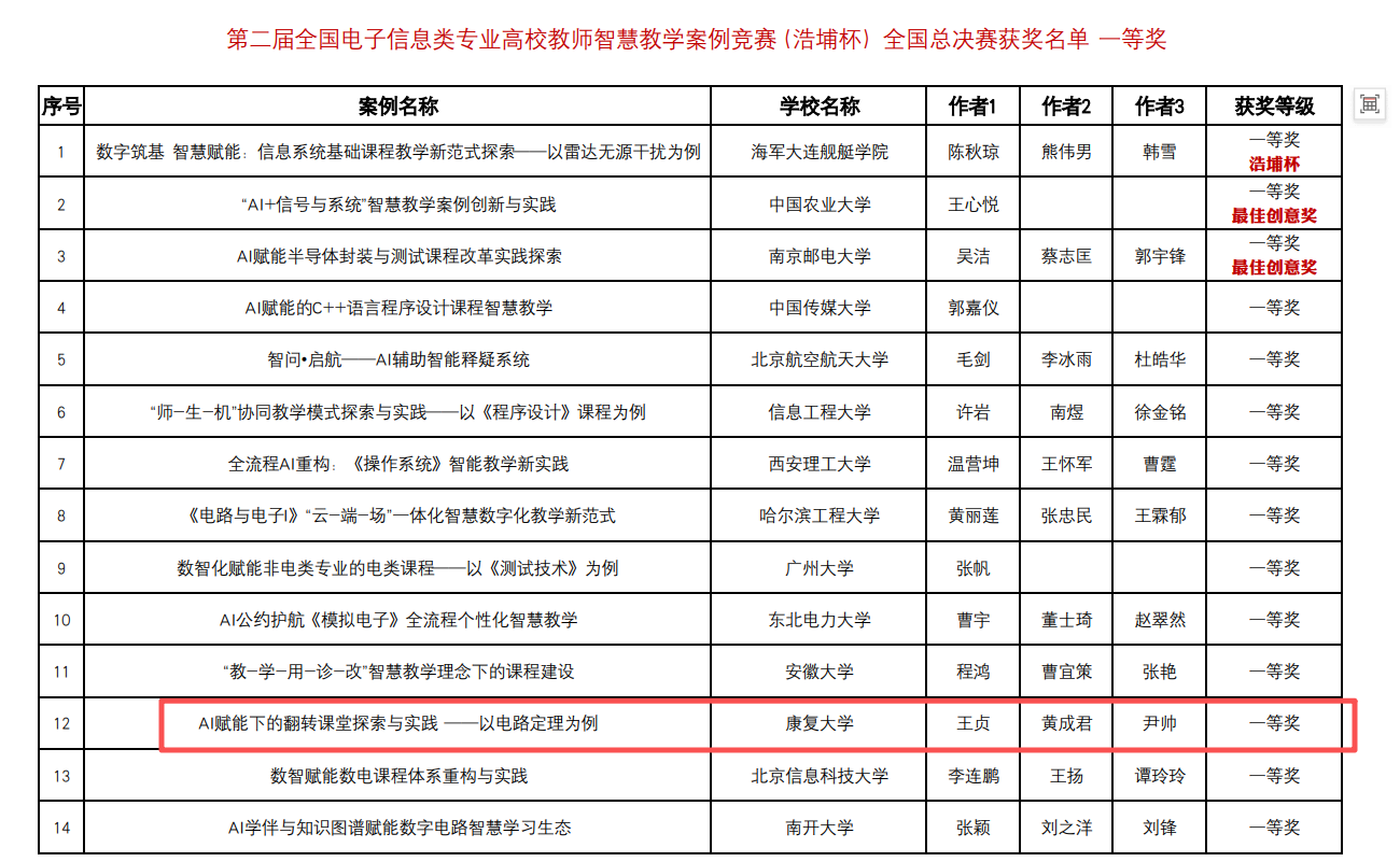 10月24日至27日,第二屆全國電子信息類專業高校教師智慧教學案例競賽(浩埔杯)全國總決賽在北京郵電大學隆重舉行。康復大學康復科學與工程學院王貞、黃成君、尹帥教師團隊憑借“AI賦能下的翻轉課堂探索與實踐——以電路定理為例”案例,榮獲全國一等獎的優異成績。